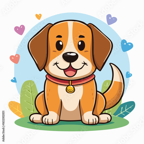 Adorable cartoon dog illustration with hearts and plants for children's content