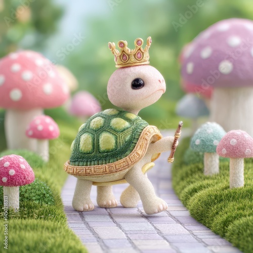 turtle, figurine, cartoon, crown, gold, wand, mushroom, pastel, moss, path, whimsical, fairy tale, cute, adorable, fantasy, magic, illustration, artwork, three-dimensional, rendering, digital, art, pink, green, white, miniature, toy, charming, sweet, innocent, artistic, creative, decorative, collectable, mythical, magical, creature, storybook, enchanting, delightful, childlike, wonderland, royalty, regal, prince, princess, kingdom