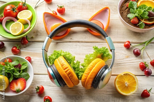 food photography, earphones, cute, adorable, banner, flier, wallpaper, food, dessert, fruit, vegetable, pastry, hot drink, tea, cake, cookie, pizza, pasta, burger, snack, breakfast, lunch, dinner, background, design, image, graphic, print, marketing, advertising, promotion, product, colourful, appetising, realistic, vibrant, delicious, tasty, epicure, modern, trendy, stylish, aesthetic, digital artwork