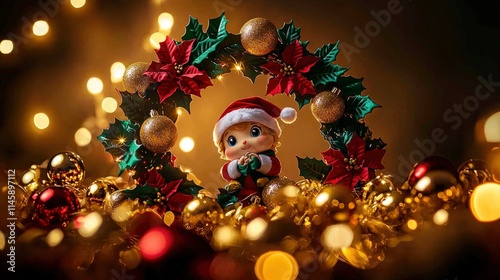 Adorable Christmas Elf Figurine Nestled in Festive Wreath with Golden Ornaments and Sparkling Lights