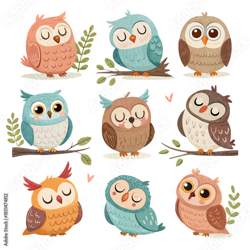 Adorable collection of eight cute cartoon owls in different poses like sleeping winking flying and standing on a white background.