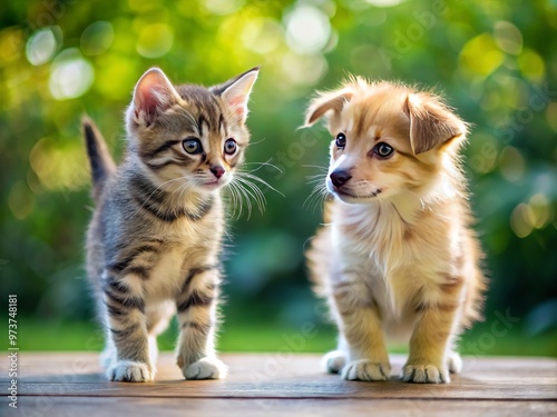 Adorable curious kitten watches intently as playful puppy approaches, both furry friends interacting and exploring