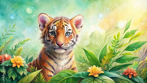 tiger, baby animal, watercolor, illustration, wildlife, cute, nature, art, children, decor, colourful, playful, forest, jungle, fauna, adorable, soft, background, greenery, wild, portrait, animal, serenity, charming, vibrant, young, species, cuddly, creative, design, childcare center, toddler, children, education, learning, biodiversity, conservation, habitat, environment, imaginative, fantasy, artistic, tender, love, companionship, innocence
