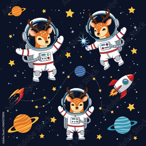 cervid, astronaut, space, star, planet, rocket, cartoon, cute, illustration, vector, animal, cosmos, galaxy, universe, children, children, fun, playful, whimsical, design, graphic, background, pattern, artwork, adorable, charming, festive, holiday, children, happy
