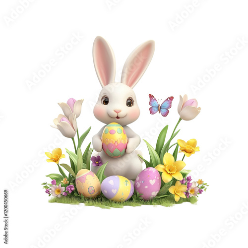 easter, rabbit, rabbit, egg, easter egg, spring, flower, tulip, daffodil, butterfly, pastel, cute, adorable, three-dimensional, rendering, illustration, holiday, celebration, springtime, festive, cheerful, happy, joy, innocence, colourful, decoration, design element, graphic, image, background, card, banner, website, season, nature, wildlife, animal, mascot, character, cartoon, whimsical, sweet, pretty, vibrant, greeting card