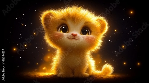 baby animal, cute, glowing, fluffy, cartoon, whimsical, animation, adorable, mammal, fur, eye, animal, character, illustration, creature, design, fantasy, smile, funny, portrait, soft, happy, art, dreamlike, gold, artistic, background, sweetness, sparkle, light, shimmer, dreamy, innocence, children, playful, magic, plush, tenderness, radiant, glow, vibrant