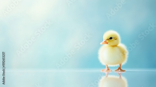 Adorable fluffy duckling standing against a soft blue background
