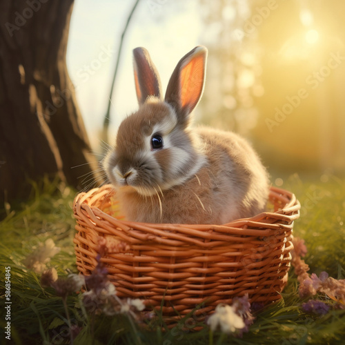 adorable fluffy little bunny in a basket against a spring background with Easter eggs, easter card