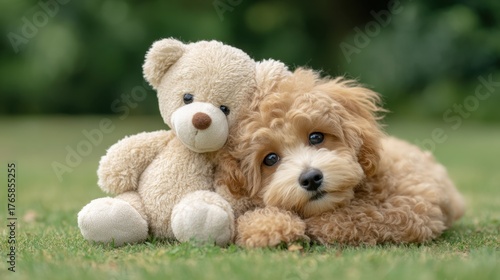 Adorable fluffy puppy resting next to a soft teddy bear in a serene green outdoor setting, showcasing friendship and innocence in nature