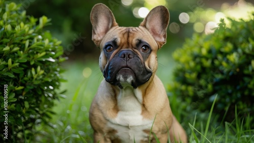 Adorable French Bulldog: A charming French bulldog with expressive eyes sits alert in a sun-dappled garden setting, captured with detailed clarity.