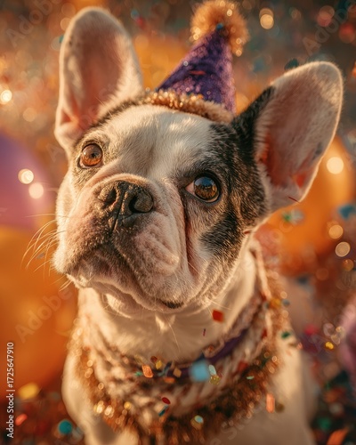 french bulldog, dog, pet, party, celebration, confetti, party hat, festive, puppy, birthday, joyful, canino, playful, cheerful, event, animal portrait, fun
