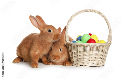 Adorable furry Easter bunnies near wicker basket with dyed eggs on white background