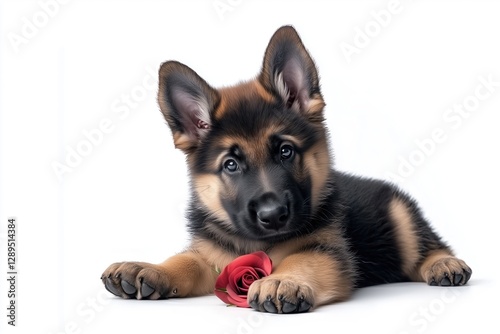Adorable German Shepherd puppy lying on a white background with a red rose, gazing with sweet and curious eyes. Cute and romantic pet concept.
