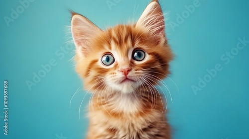 Adorable ginger kitten with bright blue eyes stares intently at the camera against a vibrant teal background. A captivating portrait of feline innocence.