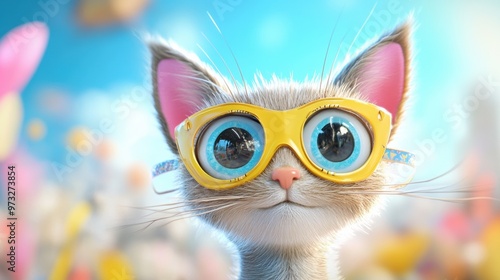 Adorable Ginger Tabby Kitten Wearing Oversized Colorful Sunglasses Against Bright Background