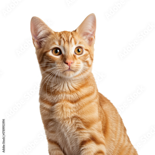 kitten, cat, ginger, tabby, orange, animal, pet, cute, adorable, domestic, felino, young, baby, small, portrait, studio, isolated, background, plain, white, transparent, eye, looking, curious, alert, whisker, mammal, creature, companion, playful, innocent, paw, fur, striped, pattern, head, face, closeup, composition, content, photo, purebred, breed, wildlife, nature, wild animal