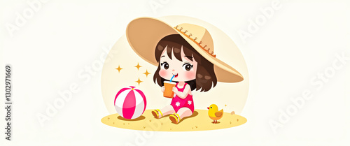 girl, beach, summer, drink, hat, children, swimwear, sunhat, happy, cute, adorable, joyful, playful, cheerful, vibrant, bright, refreshing, relaxing, peaceful, fun, casual attire, sweet, innocent, carefree, positive, content, excited, smiling, delightful, sunny, vacation, holiday, sea, sand, ocean, chick, playtime, relaxation