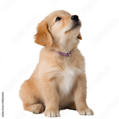 Adorable golden puppy with soft fur sitting and gazing upwards with curiosity. Cute and playful companion.