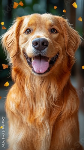 Adorable Golden Retriever Dog Celebrating with "2025" Text and Golden Confetti on a White Background. A Joyful New Year Concept, Featuring a Postcard-Style Design with Space for New Year Messages