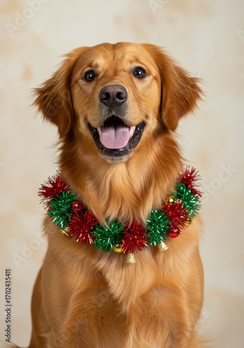 golden retriever, dog, christmas, holiday, festive, garland, puppy, pet, animal, adorable, cute, happy, merry christmas, winter, season, decoration, red, green, gold, bell, tinsel, furry, canino, portrait, christmas season, festive season, holiday season
