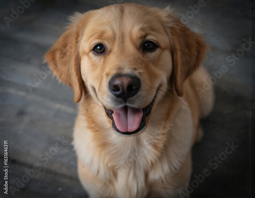 Adorable golden retriever puppy looks directly at camera with happy expression, tongue out. Cute dog sits on wooden floor, perfect for pet lovers, families, anyone seeking cheerful canine