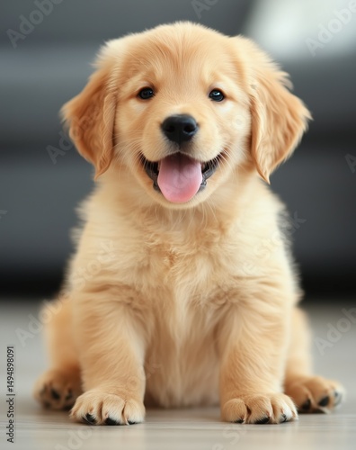 Adorable golden retriever puppy sitting indoors with happy expression