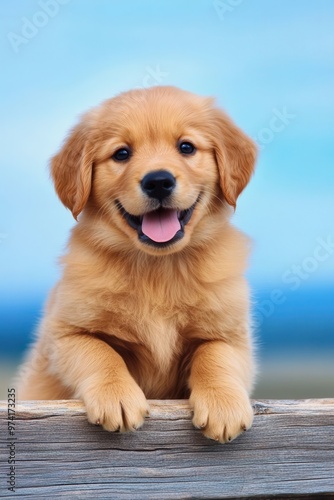 Adorable golden retriever puppy with a joyful expression, leaning on a wooden fence against a beautiful outdoor backdrop.