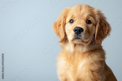 puppy, dog, golden retriever, pet, canino, purebred, animal, portrait, cute, pedigree, furry, blue eye, studio shot, grey background, friendly, innocent, animal head, closeup, animal portrait, professional photo, veterinary, loyal, obedient, gentle