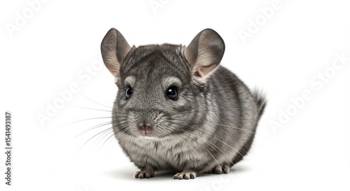 Adorable grey chinchilla sits alertly against bright white background soft light enhances its fluffy fur. AI Generated