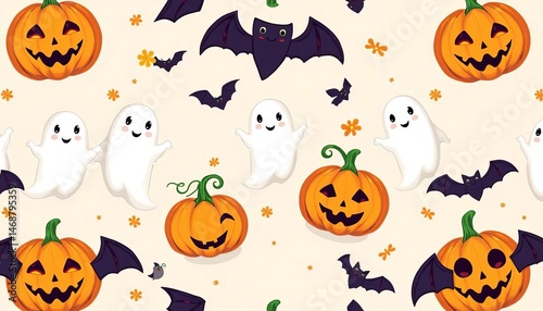 Adorable Halloween seamless pattern featuring friendly ghosts, pumpkins, and bats on a pastel background, pumpkin, wrapping paper
