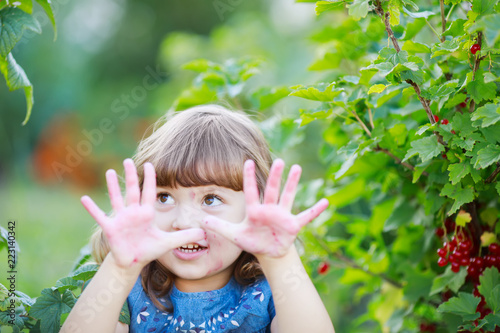 Adorable happy little girl at the garden, eating red currant and smiling