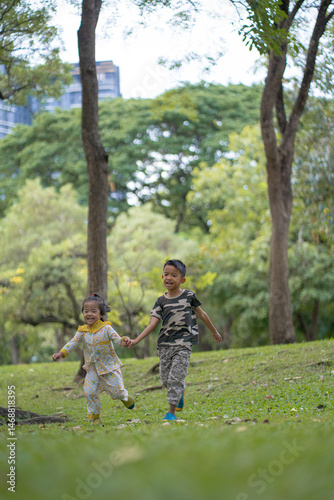 Adorable kid boy and girl enjoy run on greeen meadow grass city park