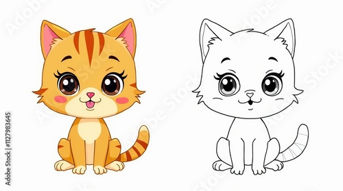 Adorable Kitten Cartoon Character in Color and Outline Versions