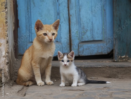 kitten, cat, duet, resting, blue, door, rustic, adorable, cute, pet, pavement, wall, small, young, animal, companion, colourful, texture, street, urban, innocence, fluffy, eye, playful