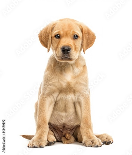 Adorable Labrador Retriever puppy sitting with a curious expression, isolated on white background - Generative ai