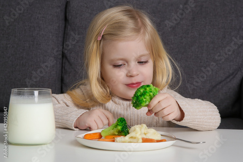 Adorable little girl eating vegetables. Dieting Concept. Healthy eating habbits for kids.
