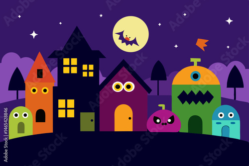 night, house, halloween, moon, sky, illustration, city, vector, tree, home, silhouette, building, cartoon, dark, town, castle, window, star, architecture, light, landscape, holiday, bat, art, skittish