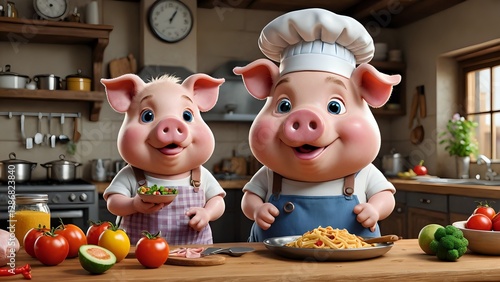 Adorable mother and daughter pig duo bonding in the kitchen baking together with love and laughter perfect for family food and lifestyle themes