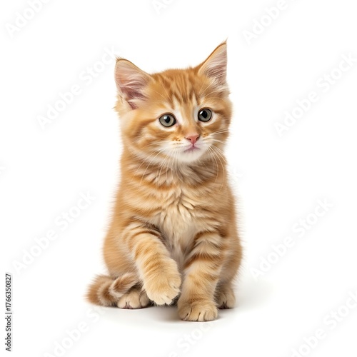 kitten, cat, orange, tabby, ginger, cute, adorable, pet, animal, domestic, felino, young, baby, studio, shot, white, background, isolated, sitting, paw, raised, playful, curious, innocent, fluffy, furry, portrait, small, mammal, companion