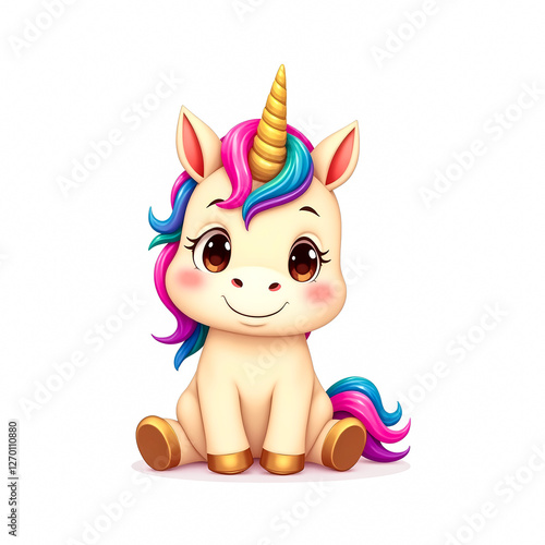 adorable pastel unicorn with vibrant mane and tail sitting on white background