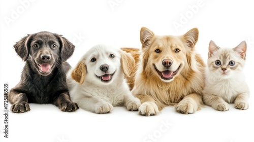 Adorable Pets Posing Together: A Golden Retriever, Two Puppies, and a Kitten