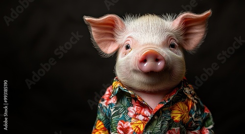 baby pig, pig, animal, sweater, cosy, cute, portrait, closeup, pink, ear, snout, fur, texture, clothing, wool, buttons, friendly, farm, mammal, warm, fashion, expression, eye contact, farm animal, detailed, whisker, fuzzy, young, domestic, soft, warmth, charming, character, pet, dark background, fun, innocence, realistic, whimsical, playful, orange, brown, design, art, generative, ai
