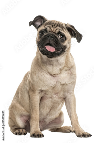 Adorable pug dog sitting and panting, isolated on transparent background