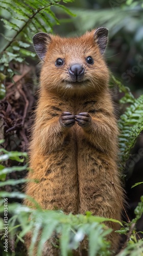 Adorable quokka standing on hind legs amidst lush green ferns.
