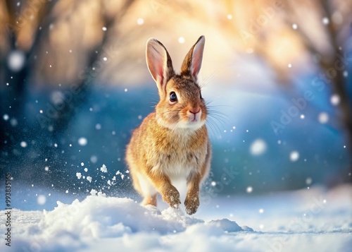 Adorable Rabbit Hoping Through Soft Snowflakes in a Winter Wonderland Landscape of White Snow