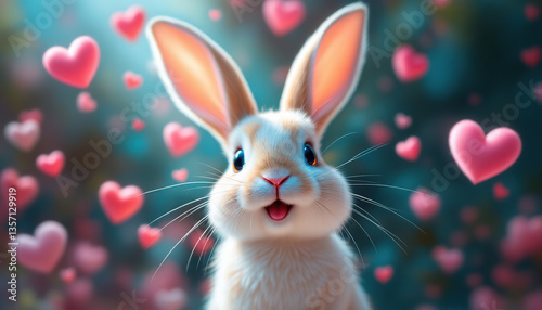 Adorable rabbit smiling amidst floating pink heart shaped symbols