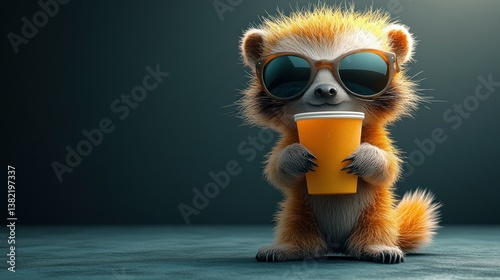 raccoon, cute, animal, cartoon, digital, art, three-dimensional, sunglasses, hot drink, drink, adorable, furry, pet, funny, wildlife, nature, plush, plush toy, character, design, illustration, graphic, poster, print, gift, children, children, summer, hot, cool, fashionable, accessory, holding, small, orange, yellow, cartoonish, image, graphic design, digital artwork