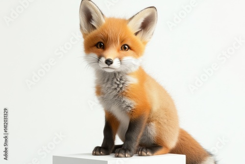Adorable red fox kit sitting on a white surface, fluffy fur, captivating gaze.