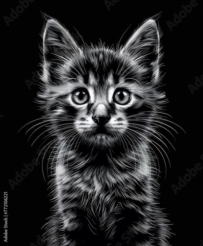 digital illustration, adorable, kitten, cute, felino, drawing, artwork, pet, playful, fur, animal, artistic, illustration, creative, cat, whimsical, black-and-white, digital artwork, charming, generated, generative, image, ai