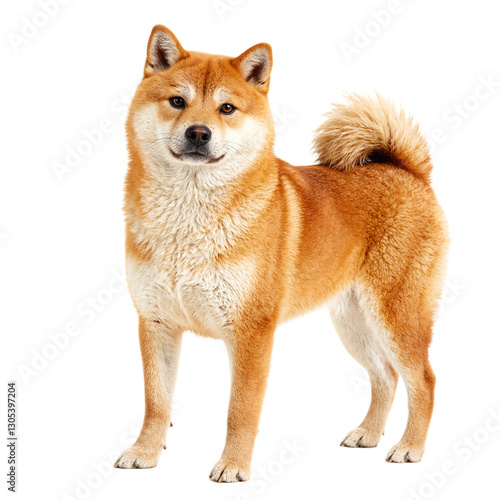 Adorable Shiba Inu with a fox like face and curled tail showcasing its bold character and red brown coat on a white background